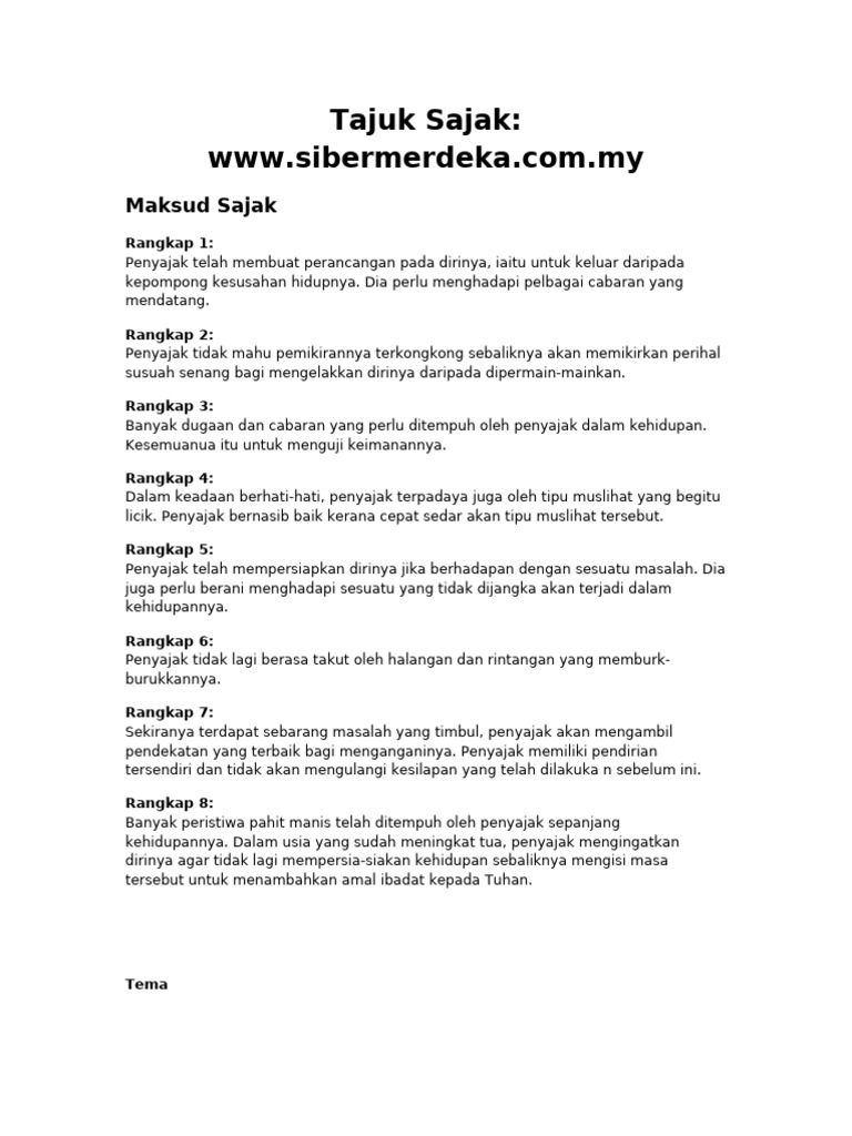 Ketabahan insan dalam mendepani dugaan hidup. ← tema dan pengajaran (komsas tingkatan 4). 6122 hits tema maksud sajak persoalan bentuk gaya bahasa nilai modul prigel komsas tingkatan 4 3. Sajak www sibermerdeka com my komsas tingkatan 4 pada 11 1 2016 jumlah : Tema tema sajak ini ialah ketabahan seorang insan untuk menghadapi dugaan hidup.hal yang demikian kerana penyajak pernah terpedaya oleh tipu muslihat yang licik tetapi sabar menghadapinya.selain itu.